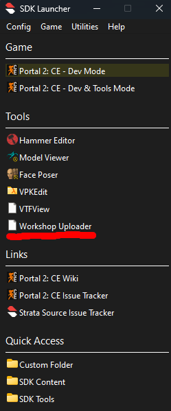 The first step of using the Workshop Uploader is to launch it. You can find the Workshop Uploader by launching the SDK Launcher, then double-clicking the "Workshop Uploader" button under the "tools" heading.